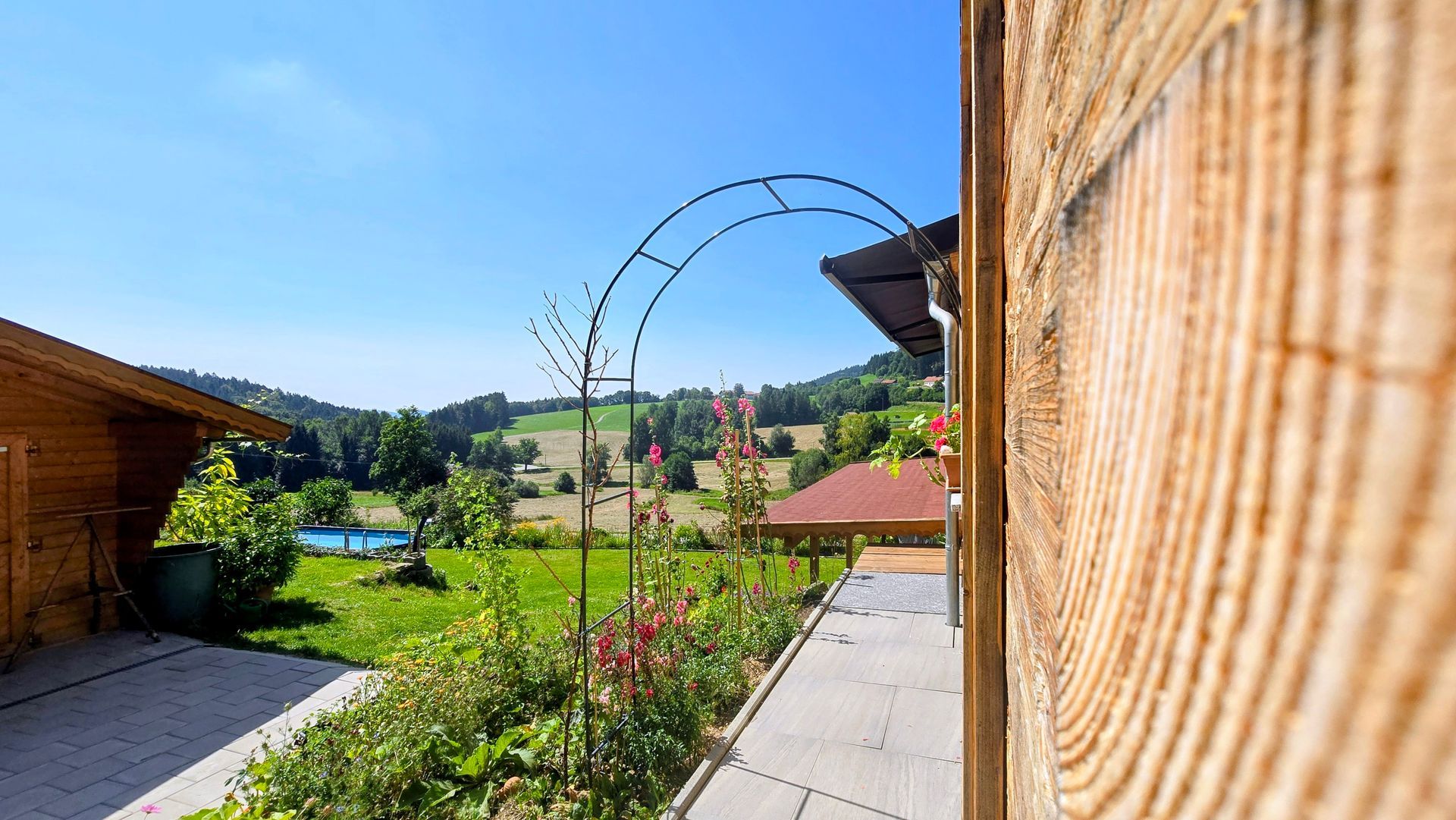 A well-maintained, beautifully landscaped property with clear zoning: separate parking spaces for the main entrance and granny flat, a paved driveway leading to the massive garden shed (approx. 30 m²) and the very spacious garage. A pond with a watercourse provides a tranquil accent in the driveway. The garden is designed as a family and kitchen garden, featuring high-quality planting areas, retaining walls, a large vegetable patch, and several fruit trees. A swimming pool provides cooling in the summer; access to the garden is conveniently provided via the conservatory. Terraces and balconies offer sunshine at different times of day and beautiful panoramic views.