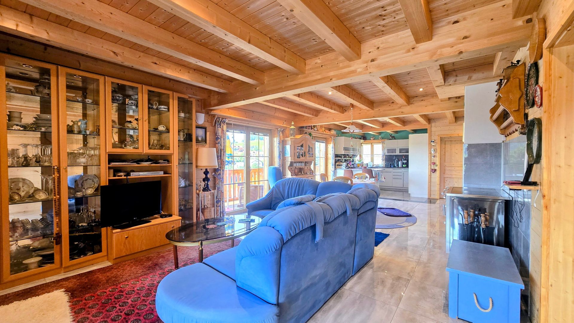 - Open living area with Lohberger wood stove with oven in the open living/dining area – the warm heart of the house