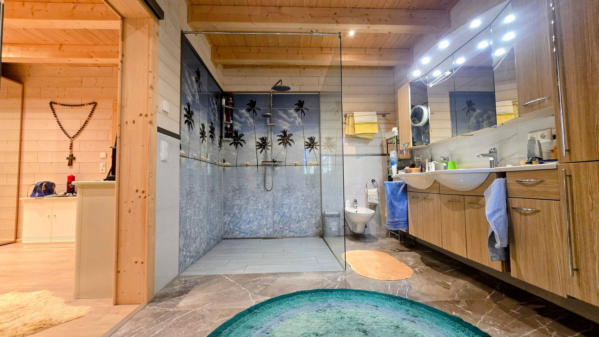 The attic features a second, spacious living area with a studio feel: a glass-enclosed bathroom en suite to the bedroom, a separate living area, and two converted bedrooms, one of which has kitchen connections. Ideal for guests, older children—or for a separate living unit with privacy and a view.