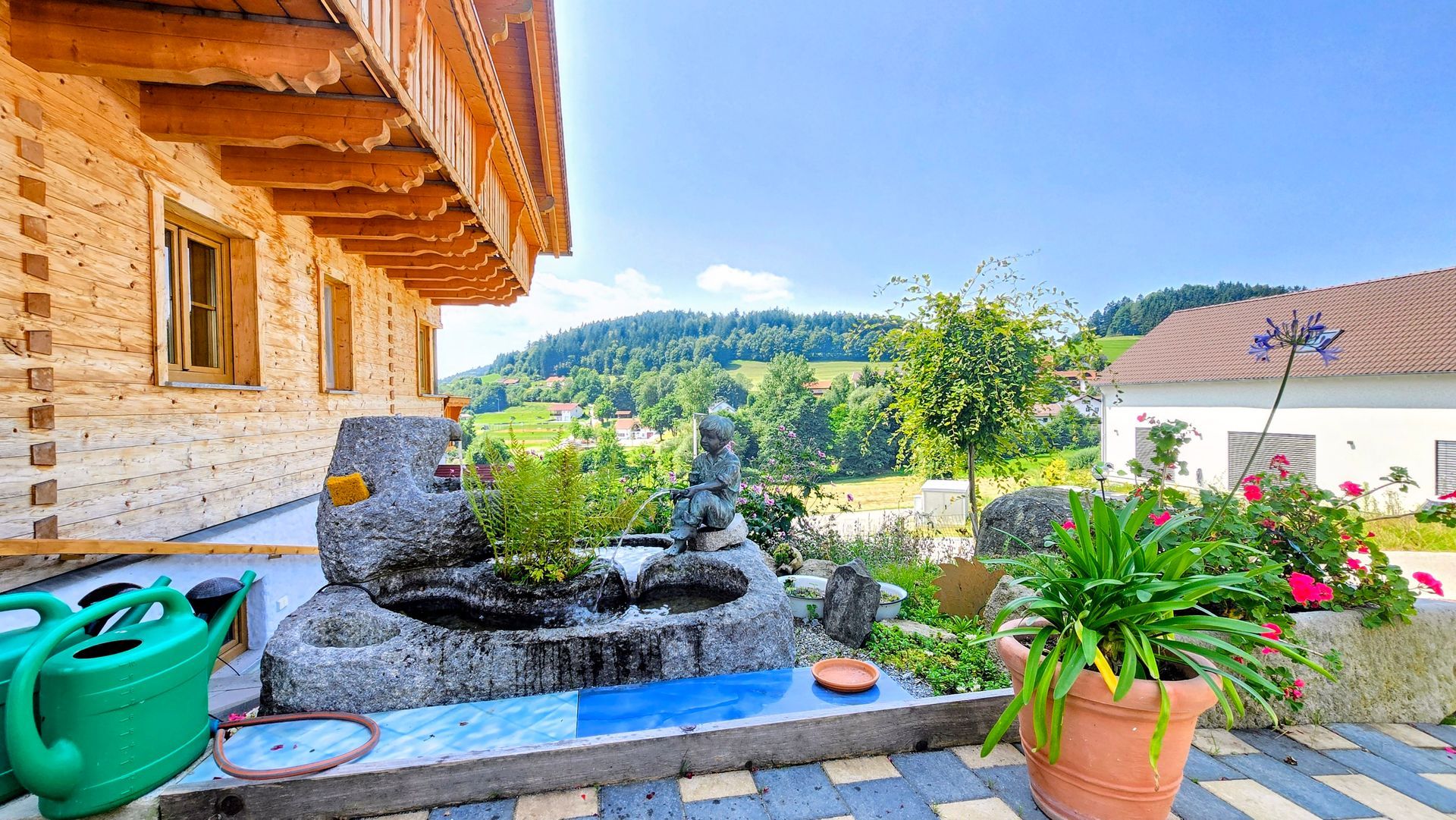 Terase i prostori za sjedenje na različitim razinama, bazen s pogledom, uređene površine za sadnju, veliki vrt s povrćem i zrela voćka stvaraju zelenu oazu s praktičnom namjenom. Ribnjak s vodotokom u ulaznom prostoru poziva vas da na trenutak zastanete. Masivni potporni zidovi prirodno strukturiraju imanje.